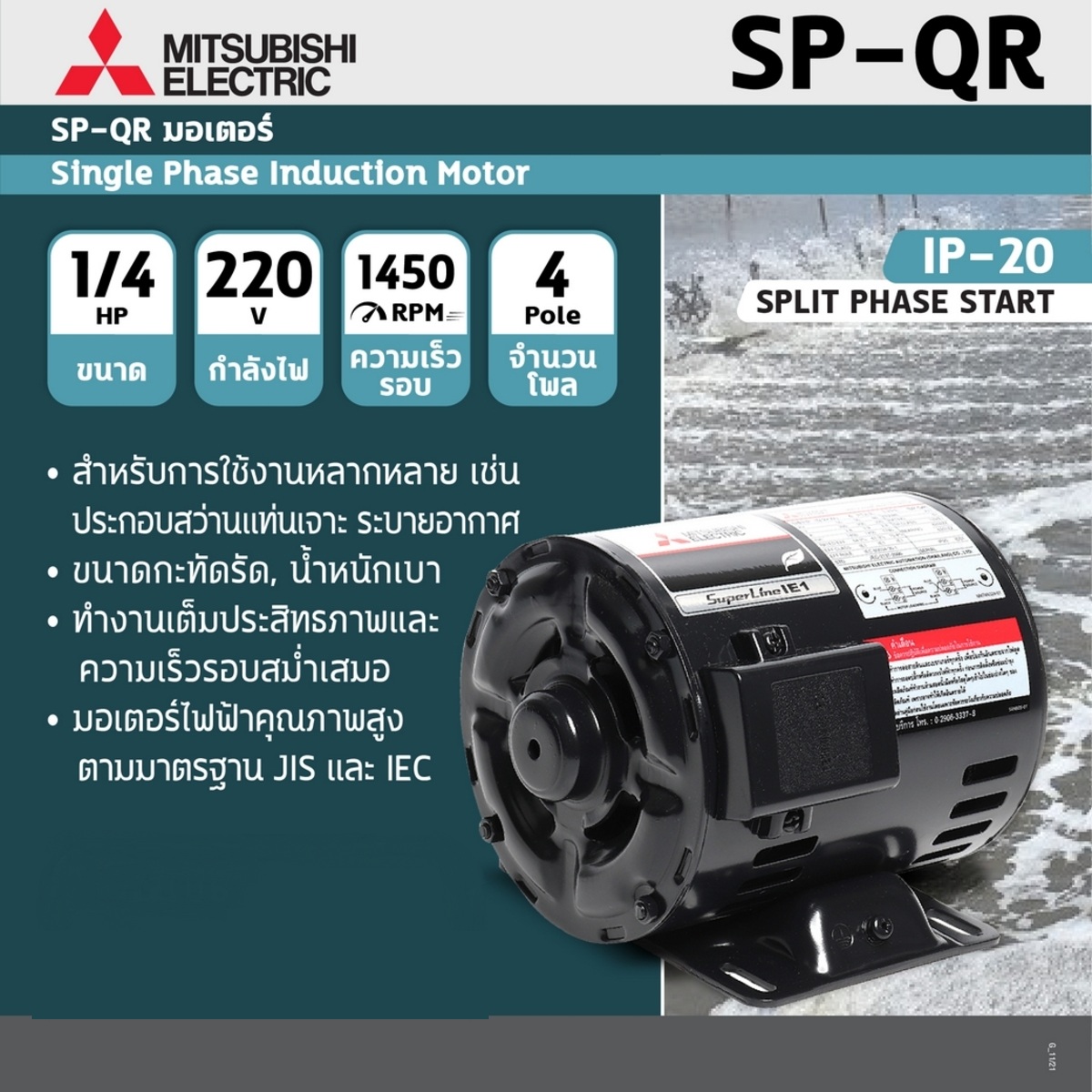 MITSUBISHI มอเตอร์ MOTOR รุ่น SP-QR กำลัง 1/4 แรงม้า (0.2 กิโลวัตต์) 1 เฟส 220 โวลต์ 4 โพล 2 สาย IP20 ความเร็วรอบ 1450 RPM (รอบต่อนาที)